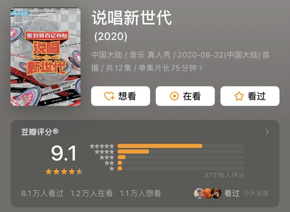 2020年的《说唱新世代》可能是近年最后一档高分说唱节目(豆瓣9.1分),在《中国有嘻哈》里张震岳“觉得不行”的Ty.(唐溢),在这里与当年diss过的黄子韬原地和解。虽然这档节目在说唱受众中有“形式大于内容”的争议,但它确实是档优秀的真人秀节目,群像刻画可圈可点,让不少rapper收获了名气和流量。