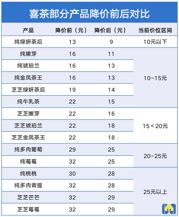 纯茶类产品降价后最便宜,比如纯绿妍茶后从13元降到9元、纯嫩芽从16元降到11元、芝芝绿妍茶后从19元降为14元;乳茶品类降价幅度最大,比如纯牛乳茶从22元到15元,直降7元;水果茶中的纯莓莓也降了7元,现价25元,另外,多肉葡萄不带芝士版从29元降至25元,芝芝莓莓/芒芒则从32元降到29元;小料中,芝士也降了1元。