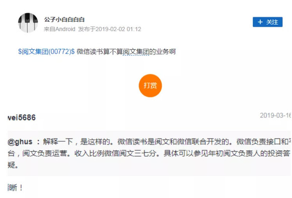 不过,一开始的几年,微信读书一直不温不火,甚至业内对这个产品在腾讯体系内的归属权问题也不清楚,它到底属于阅文集团,还是属于微信?有人在阅文集团的投资者关系平台回答,阅文和微信双方共同拥有,收入三七分。