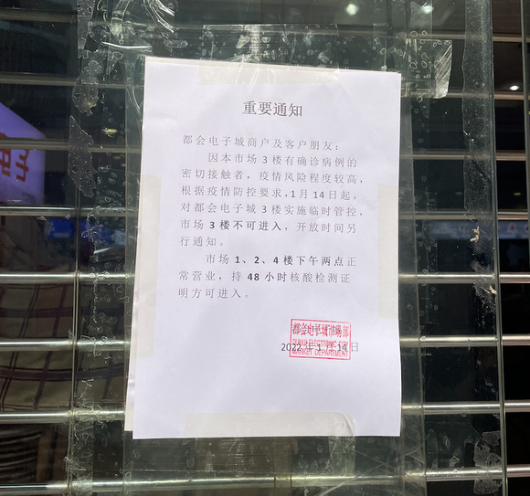 贴在都会电子城门口的一份通知显示:因电子城内3楼有确诊病例的密切接触者,疫情风险程度较高,根据疫情防控要求,1月14日起,对都会电子城3楼实施临时管控,市场3楼不可进入,开放时间另行通知。