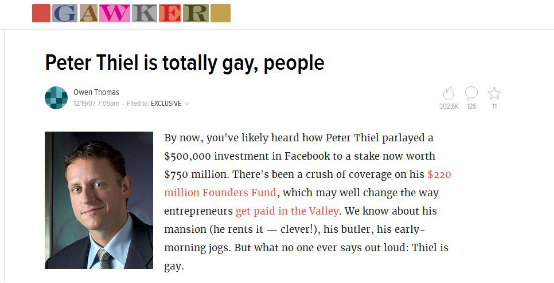 回到2007年的时候,美国知名商业博客网站Gawker旗下的一个硅谷著名八卦网站ValleyWag发布了一篇名为《Peter Thiel is totally gay,people》的文章。