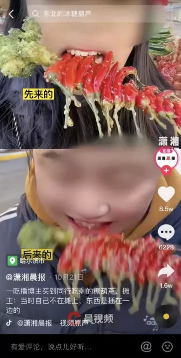 因为同行实在太多,闹出的抓马事件也不在少数。有哈尔滨的两个探店主播,在同天下午先后去了同个糖葫芦摊拍视频,后一个主播经网友提醒才发现,自己的糖葫芦竟是上个主播咬过的。
