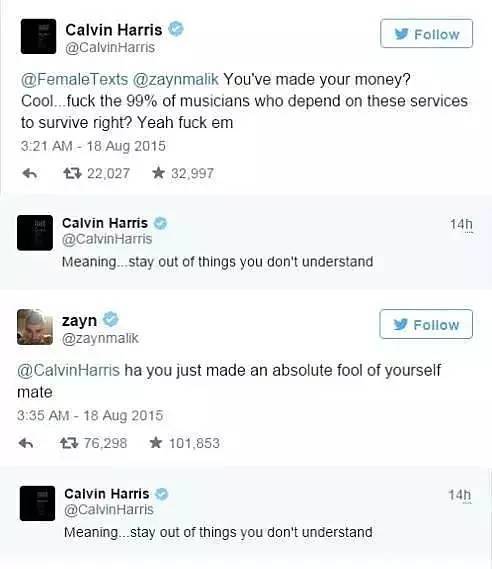 Calvin Harris也把霉霉当成掌中宝。在Twitter因音乐付费问题屡屡为霉霉说话,手撕Zayn Malik。