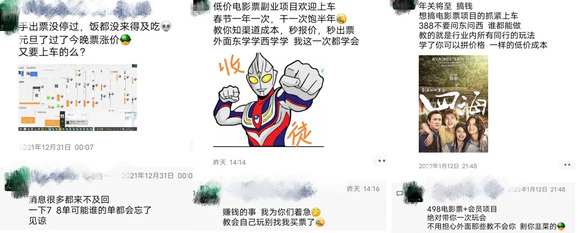 既要销售、又要“拉人头”,这样的模式不正和微商如出一辙?在与票贩深入交流之后发现,倒卖电影票,已经形成了一套娴熟的横跨QQ、微信、知乎、豆瓣、贴吧等各个平台的售卖体系。