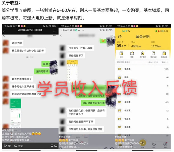多刷几篇投放的软文后大致可以总结出行文的套路:先介绍低价电影票的行情很好,尤其是现在票房冠军能高达50多亿,中间的利润很高;然后普及一些正确薅羊毛的手段,并站在买家的角度循循善诱,利人利己,复购率高;最后展示自己的交易记录、挣了多少钱,并称这是可以月入过万的副业,再附带上微信号收尾。