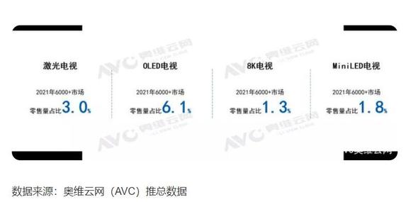 此外,6000元以上高端市场占比来看,这几类显示技术也可谓是“旗鼓相当”。其中,激光电视零售量份额达到3.0%,OLED电视零售量份额达到6.1%,8K电视零售量份额达到1.3%,MiniLED电视零售量份额达到1.8%。
