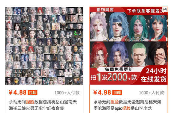 我们制作好的捏脸数据一般都会卖给淘宝的商家,一般能够从卖家那里抽成40%左右,如果自己买则是100%的利润。淘宝上效率最高的几家店铺,基本都有我的作品,涉及的游戏包含《天涯明月刀》、《剑灵》、《永劫无间》等,月入在几千元。我的朋友则是自己开工作室,全职投入到游戏捏脸中,月入十万。