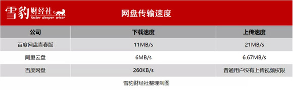 最大的差异是免费用户的传输速率。雪豹财经社选择了一个2.41G的视频,并与声称免费且不限速的阿里云盘,以及非会员账号的百度网盘进行对比,发现青春版在下载和上传文件速率上,均远远超过前二者。