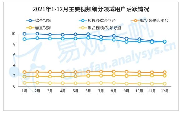 在各个细分行业中,综合视频12月活跃用户为8.42亿人,短视频综合平台为8.47亿人,短视频综合平台近一年来用户规模首次超过综合视频,成为用户规模最大的视频细分领域。