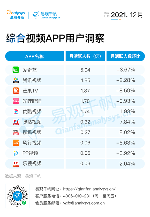 12月,头部综合视频平台活跃用户规模仍有一定下跌,但其中搜狐视频、咪咕视频分别以8.02%、7.84%的环比保持明显领先的正增长趋势。2021年12月综合视频平台有以下动态值得关注:
