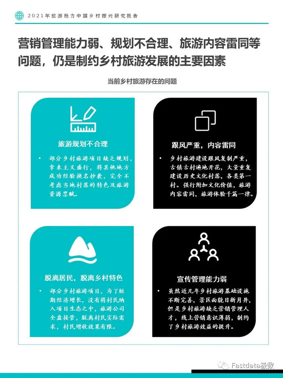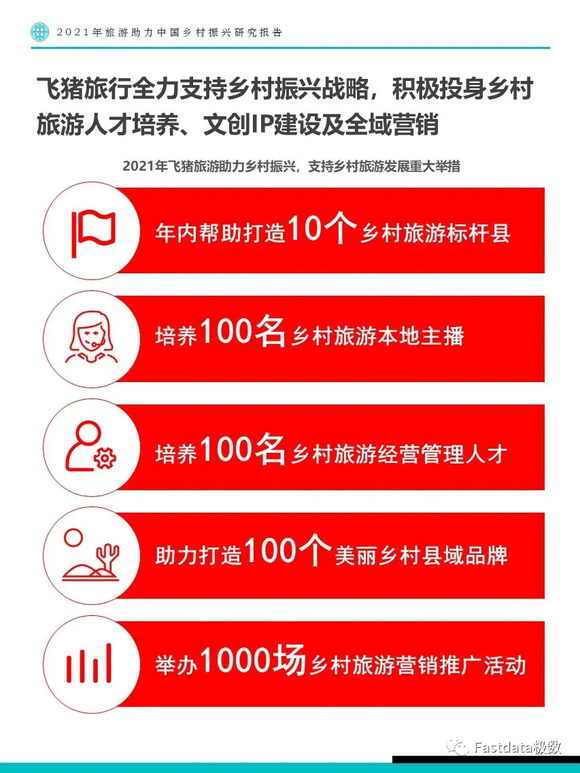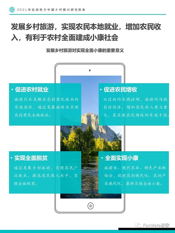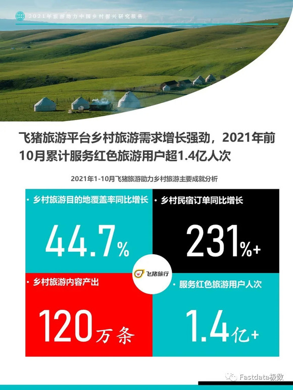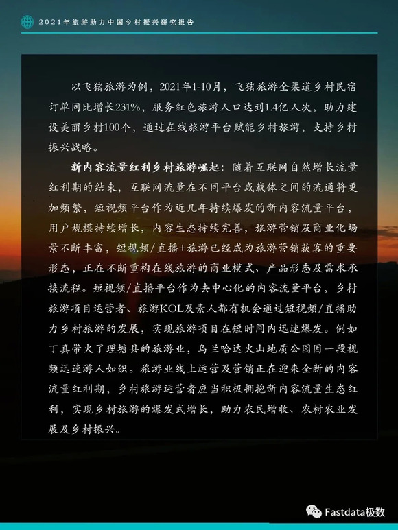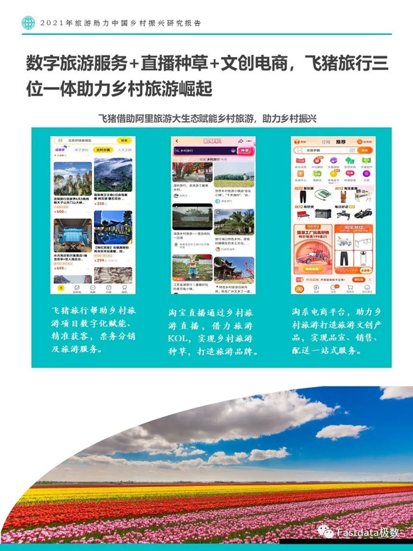 互联网+旅游是实现乡村振兴的重要抓手:线上营销及获客已经成为旅游业提质增效的关键环节,借助在线旅游大数据分析、人群画像、需求预估、精准广告投放、智能营销及需求承接等,实现乡村旅游项目品牌知名度快速提升、获客能力持续增强、经营效益大幅改善及带动乡村经济发展能力持续增强。现阶段头部在线旅游平台对旅游业的营销及获客能力有着举足轻重的作用,携程旅行、飞猪旅行等在线旅游平台已经在推动乡村旅游发展中发挥着重要的作用。