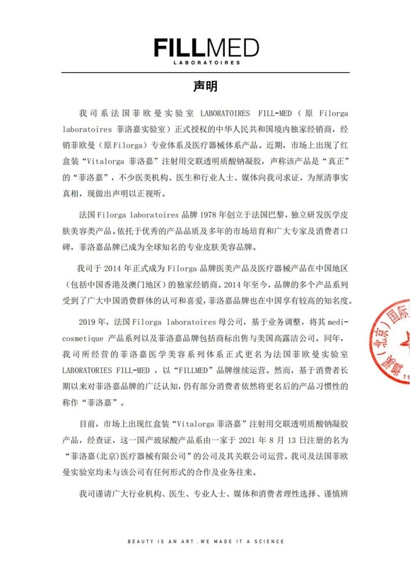 2021年8月21日,法国FILLMED菲欧曼(原Filorga菲洛嘉)的中国独家经销商——珈溪(北京)国际贸易有限公司,在官方微信公众号“FILLMED菲欧曼”发布声明,表明菲洛嘉(北京)医疗器械有限公司及其销售的红盒装“Vitalorga菲洛嘉”注射用交联透明质司酸钠凝胶,与法国FILLMED菲欧曼无关。