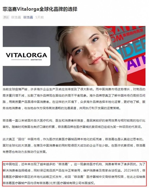 2021年8月,一篇《菲洛嘉正式落地中国并推进本土化医疗战略》的文章煞有介事的全网传播。