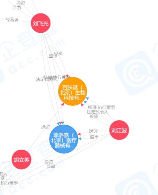 更诡异的是,百肤谜(北京)生物科技有限公司法定代表人刘江波,同时也是菲洛嘉(北京)医疗器械有限公司的股东,而菲洛嘉(北京)医疗器械有限公司的法人刘飞光,竟然也是百肤谜(北京)生物科技有限公司的股东之一。