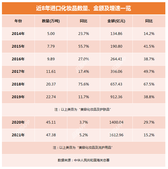 据海关总署数据,2014-2021年,化妆品进口金额逐年攀升,市场体量不断扩大。