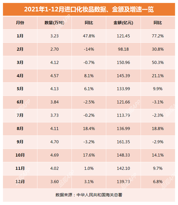 就2021年单月数据而言,进口化妆品在数量和金额上的最快同比增速均出现于1月,此后在同月增速上开始下滑,比如,进口量在2月份出现14%的负增长,进口额则在6月份出现了负增长。来到下半年,市场整体虽有回暖之势,但增长乏力,年底也仅录得个位数增长。