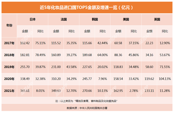 从国别来看,近5年,日本、法国、韩国、美国、英国稳居化妆品进口国TOP5。2021年,来自这5个国家的进口金额合计达1281.93亿元,约占整体的84%。换言之,市场留给其他进口国的“蛋糕”并不大。
