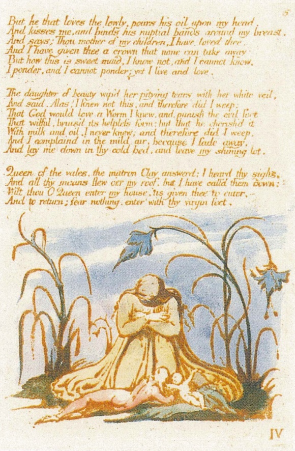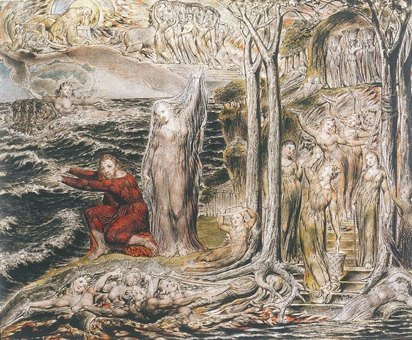 布莱克相信,诗歌和艺术的目的是唤醒回忆,即柏拉图式的回忆。他不断地呼唤“沉睡的人们”醒来,“死去的人们”复活,“洞穴人”打破他的枷锁并看到永恒的事物。 “如果一个人没有用比他必朽的肉眼所能看到的更强有力的、更完美的轮廓,更强、更美的光亮来进行想象的话,他就根本没有在想象。” 布莱克认为,世界上最伟大的艺术,描画的都是想象的完美事物。