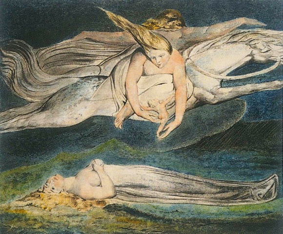 1795年,布莱克创新绘画技术,创作了一系列实验性作品,其中便包括取材于莎士比亚的四大悲剧之一《麦克白》。即将弑君夺位之际的麦克白内心充满犹豫和矛盾。他说:“怜悯像一个赤条条的在狂风中飘游的新生儿,又像一个御气而行的天婴,将要把这可憎的行为揭露在每一个人的眼中,使眼泪淹没天风。” 在布莱克的画中,身骑白马的人物“怜悯”掠过夜空,慈悲地迎接一位母亲刚刚诞下的生命。母亲虚弱地躺在大地上,而小生命正充满活力地跃入“怜悯”怀中。背景无边的夜幕宁静、神秘、深沉,仿佛包容一切快乐与悲伤,幸运与不幸。