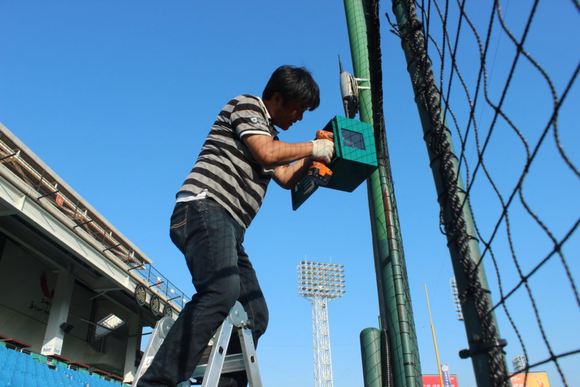 (美国职业棒球大联盟体育场,工作人员正在为高速摄像机安装防风雨外壳)