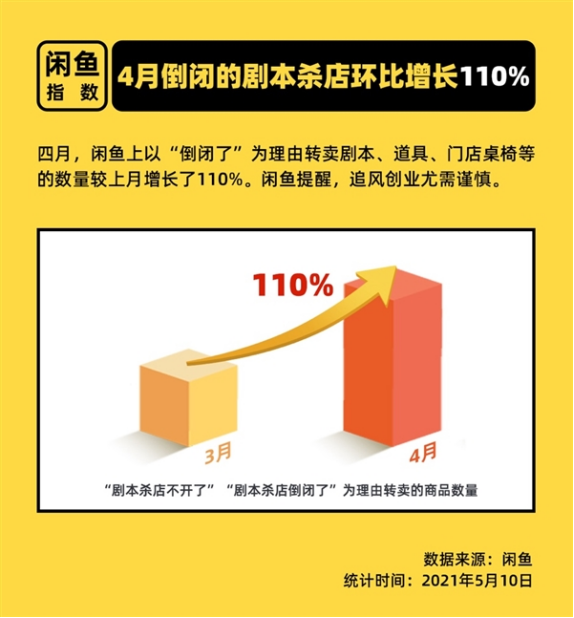 闲鱼发布的官方指数显示,去年四月,闲鱼上以剧本杀店倒闭为理由转卖剧本、道具、门店桌椅等的数量较三月增加了110%。