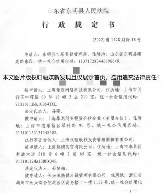 根据报道,山东省东明县市场监督管理局立案查处上海梵蓉网络科技有限公司涉嫌传销一案以及关联方上海暴龙创业投资合伙企业(有限合伙)、上海魅婉商贸有限公司、长兴蓉熙供应链管理有限公司、上海楠蓉网络科技有限公司,为防止被申请人转移隐匿违法资金,东明县市场监督管理局于2022 年1月26日向东明县人民法院申请财产保全,申请冻结上述被申请人的银行存款,财产保全数额共计 2.19亿元。
