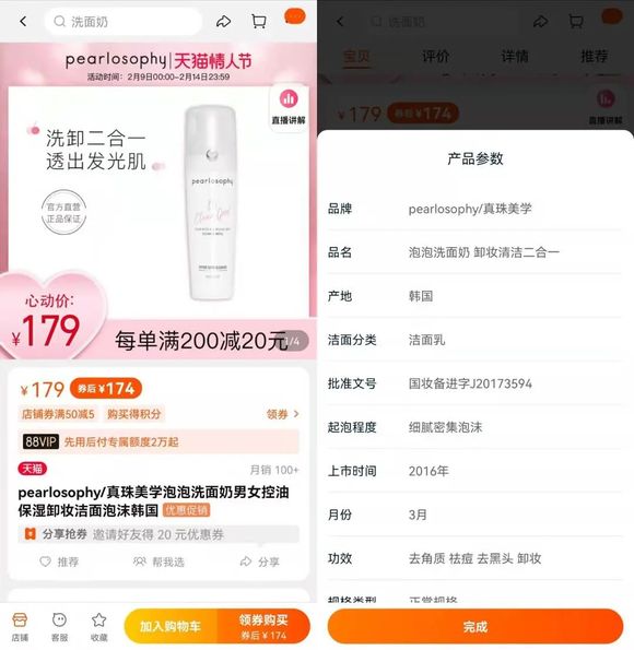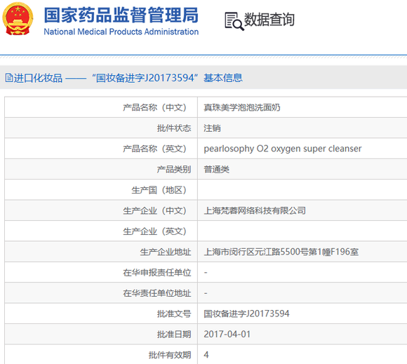 C2CC传媒&新妆资讯记者则发现,真珠美学天猫旗舰店内正在售卖的一款韩国进口的真珠美学泡泡洗面奶(批准文号:国妆备进字J20173594),在国家药品监督管理局平台的基本信息显示:批件状态为“注销”。