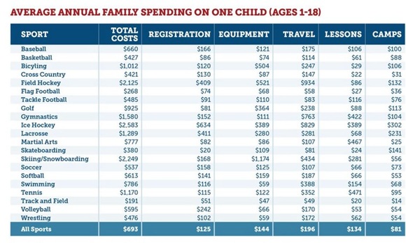 一名子女从事冰球运动每年需要花费2583美元,滑雪和雪地滑板每年要花2249美元,篮球仅需660美元、高尔夫925美元、田径191美元。