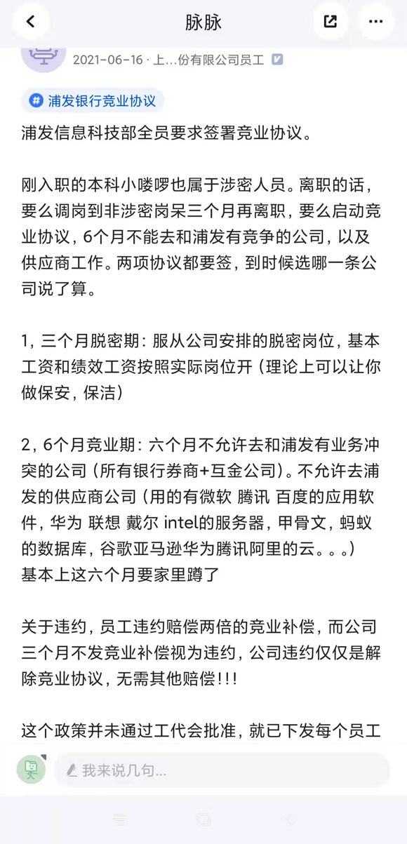 2021年6月16日新浪财经报道,有浦发银行员工爆料公司要求全员签署竞业协议,离职时要么调岗到非涉密岗呆满3个月再离职,要么启动竞业协议,6个月内不能去和浦发有竞争力的公司及供应商工作。