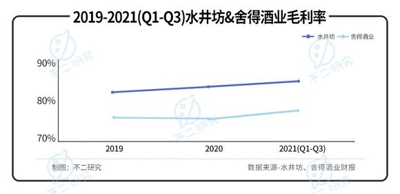 据水井坊和舍得酒业财报显示,水井坊2019-2021Q1-3的毛利率分别为82.87%,84.19%,85.11%;舍得酒业同期的毛利率为76.20%,75.87%,78.10%。水井坊的毛利率显著高于舍得酒业。