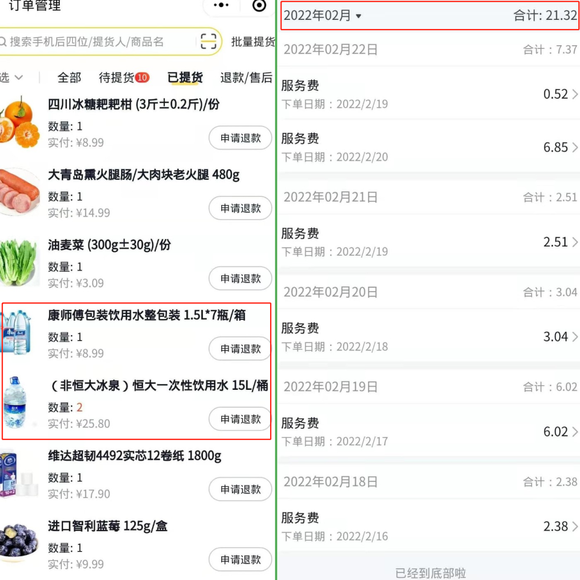 一单挣个块八毛,一百元的订单,服务费也就5、6块钱。比如,上面买水的用户,我吭哧吭哧搬运6斤重的水果以及40L的水,上下楼,跟用户一起送到车后备箱里,也就赚了6.04元的服务费。