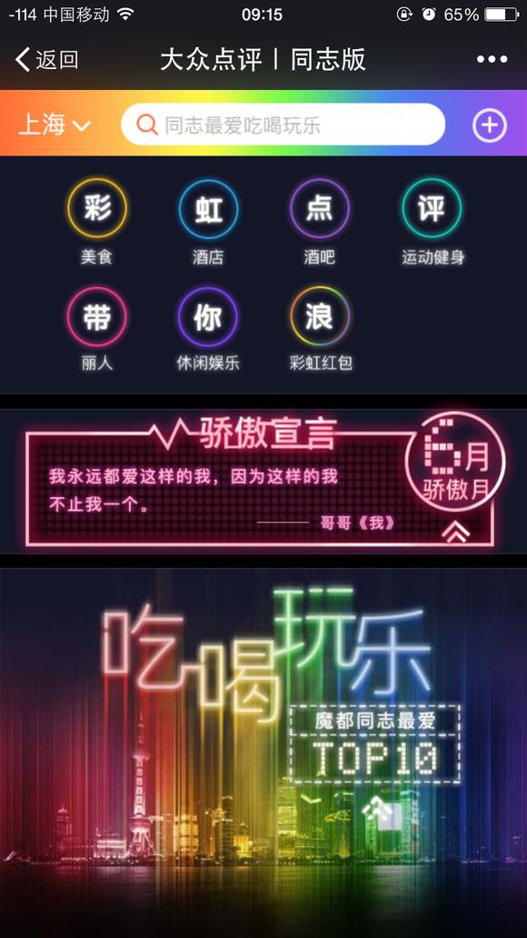 “出柜”后的大众点评,配色变成了彩虹,美食、酒店、酒吧、运动健身、休闲娱乐等也是为同志群体定制推荐,并针对北京、上海两地同志最爱光顾的吃喝玩乐场所列出了榜单。同时,页面中央还有醒目的同志“骄傲宣言”。