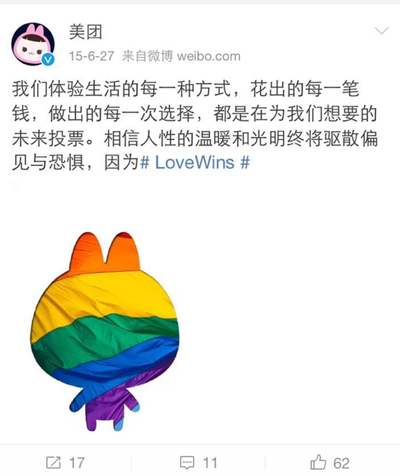 在去年6月,美团和天猫也只在微博上表态支持过LGBT群体,淘宝则赞助了7对同性情侣赴洛杉矶登记结婚,但没有透露更多信息。显然,这些品牌并不愿意进行大张旗鼓的宣传。