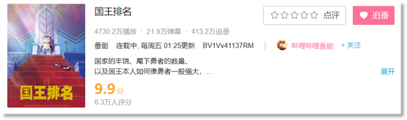 《国王排名》共23集,每集时长24分钟左右,以每周更新一集的方式在全球多个国家和地区同步播出。开播四集,《国王排名》全球口碑爆好,B站评分高达9.9,豆瓣评分9.6,IMDB评分9.4,被国内外网友评为年度最佳动画片。