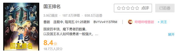 2021年10月15日,日本知名动画公司Wit Studio制作的动画片《国王排名》正式播出。
