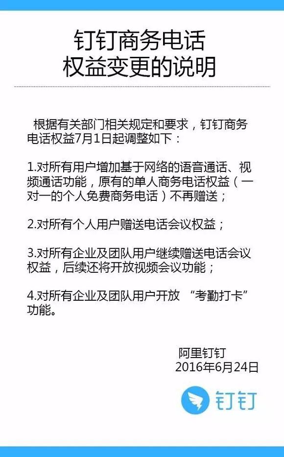 针对工信部发文,钉钉首先对商务电话的权益变更做出了说明,并于7月1日起作出调整:对所有用户增加基于网络的语音通话、视频通话功能,原有的单人商务电话权益(一对一的个人免费商务电话)不再赠送。