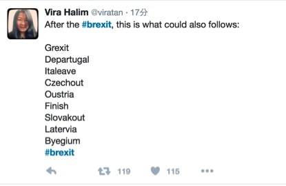 英国人于23日的公投中决定脱离欧盟,这一消息震惊了全球,但同时也为语言界贡献了一些新词,比如“Departugal”(departure和Portugal的合成词)、“Italeave”(Italy和leave的合成词)等等。总之,能退出欧盟的国家届时都犯不着为词汇问题操心了。