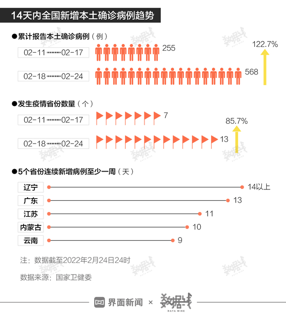 近两周全国本土病例快速上升,疫情波及省份也越来越多。据界面数据统计,国家卫健委数据显示,2月11日至24日,14天内全国累计新增本土病例823例。其中,近7成病例为7天内报告,较上周增长122.7%。从发生疫情的省份数量来看,截至2月24日,7天内报告本土病例的省份有13个,环比上周增长85.7%。至少有5个省份疫情持续超1周,辽宁疫情持续时间最长。2月10日以来,辽宁已连续15天出现新增本土病例。
