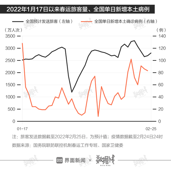 对比同期疫情数据来看,截至2月24日的14天内,全国累计新增本土确诊病例占整个春运期间新增本土病例的45%。随着春运返程告一段落,未来14天潜伏期内,全国疫情防控仍面临考验。