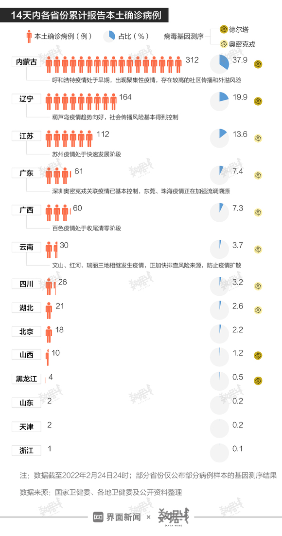 分省份来看,截至2月24日的14天内,全国新增本土病例近4成都在内蒙古,辽宁约占两成,江苏占1成多,广东占7.4%。此前,国家卫健委表示,广东深圳、珠海、东莞近期发生境外输入引起的聚集性疫情,深圳奥密克戎关联疫情已基本控制,东莞、珠海疫情正在加强流调溯源工作,全力防范疫情传播扩散风险。
