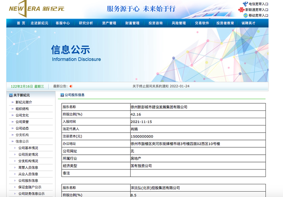 近日,界面新闻获悉,新纪元期货股份有限公司公司(下称新纪元期货)在官网更新股东名单,徐州新彭城市建设发展集团有限公司(下称徐州新彭城投)成为大股东,持股比例为42.16%,入股时间为2021年11月15日。