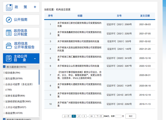 界面新闻查阅证监会官网,在机构设立变更一栏,并未查询到监管对新纪元期货股权的三次变更批复。