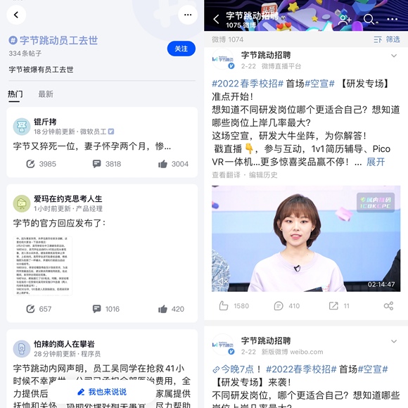 而在脉脉#字节跳动员工去世#的标签下,截至目前共有334条帖子,和字节跳动官微首页红火的招聘内容形成鲜明对比。而这一次员工猝死事件似乎又一次佐证了“字节和心脏只有一个能跳动”。