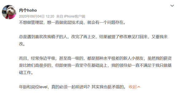 但是在技术晋升这条路断掉之后,因为没办法继续往上升,这群人也往往只能被迫想着去带人,会尤其焦虑。