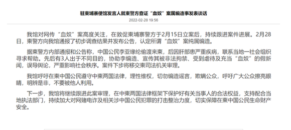 2月28日傍晚,中国驻柬埔寨大使馆发言人发表谈话称,柬埔寨警方向其通报了“血奴案”初步调查结果并发布公告,认定该案纯属编造。