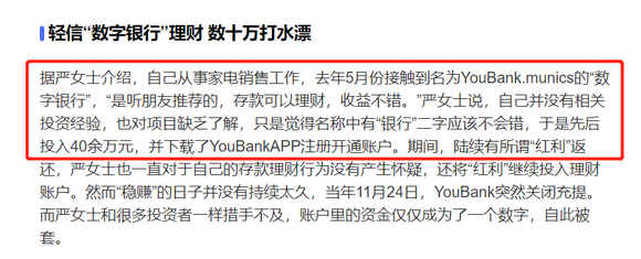 青岛官媒《半岛都市报》曾在2020年末报道一位投资人买入you bank数字货币经历,并与“网络传销案”相类比。