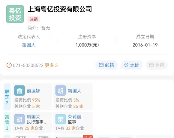 2017年11月,俞凌雄成为失信人5个月后,“中柬商会”公众号注册成立,账号主体为上海粤亿投资有限公司。爱企查显示,其法人代表胡国大在上海浙商实业等俞凌雄系公司任法人代表;大股东俞凌娜疑为俞凌雄亲属。该公司于2021年10月注销。
