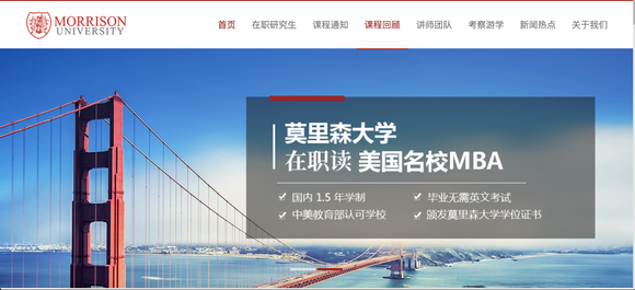 中文版“官网”介绍称,“莫里森大学”为美国百年名校,成立于1902年,为中美双认证大学。1.5年学制、毕业无需英文考试,MBA、DBA在职学位、免联考、在职读、学位国际通用。目前开设心理学、医疗健康、商业管理、金融管理和应用心理学方向的在职硕士项目。
