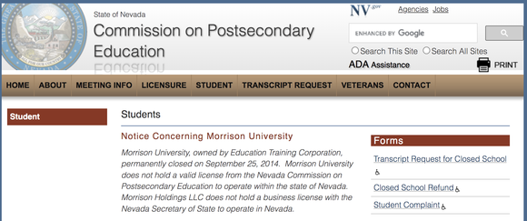 内华达州高等教育委员会(Nevada Commission on Postsecondary Education,下称NCPE)官网曾出具“关于莫里森大学的通知”,显示莫里森大学由教育培训公司所有,已于2014年9月25日永久关闭。莫里森大学未持有NCPE颁发的在内华达州内运营的有效许可证。同时,Morrison Holdings LLC 未持有内华达州的营业执照。
