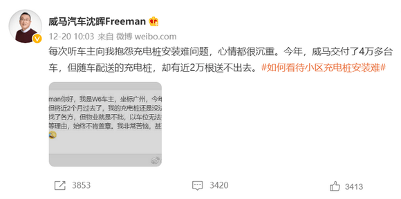 在蔚来NIO Day发布会后两天,沈晖公开“吐槽”私人充电桩安装难的问题。那些无法安装充电桩的威马车主原本可以选择晚上回到小区充电,第二天正常出行。现在只能到外面找公共充电桩充电,要么就等上1-2个小时把电充满,要么就先打车回家。从这个角度讲,上述威马车主就是买了“焦虑”。